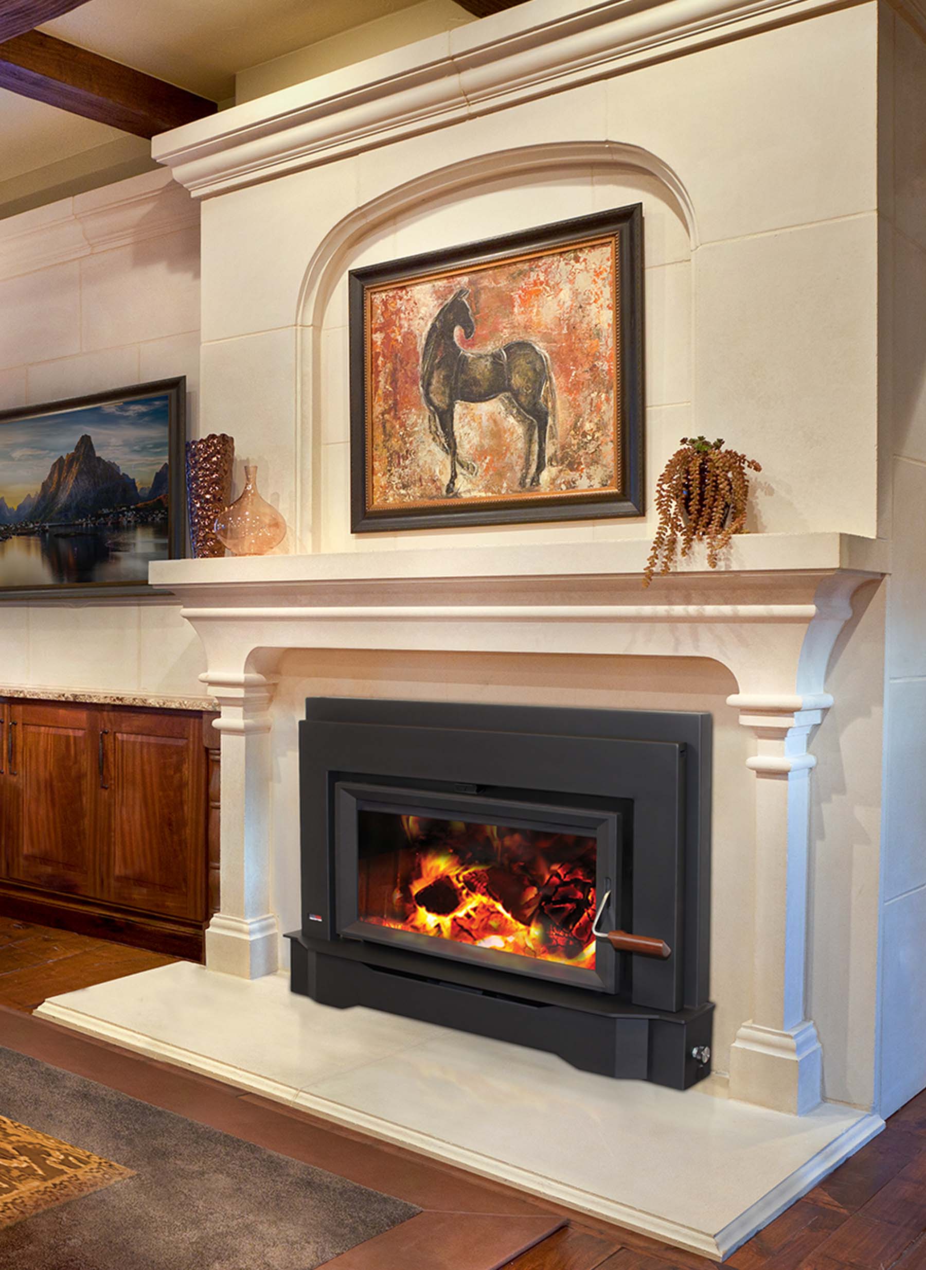 The Sirocco 25 is a medium sized fireplace insert. At 2.16 cu. ft., the tapered firebox is 22.75” wide at the front and 18” wide in the rear and can deliver warmth for up to 25 hours on low. The Sirocco 25 is very clean and efficient and can heat from 400 – 1,800 sq. ft. This flush insert extends to only 2.6 inches from the face of the fireplace to the door opening, helping to keep hearth protection to a minimum. The door features a large, 24″ x 11″, wide-screen glass viewing area with a nickel plated and hand made olive-wood door handle. Attention to detail is evident from the layered surround panel to the unique control system that allows you to select the heat you want.