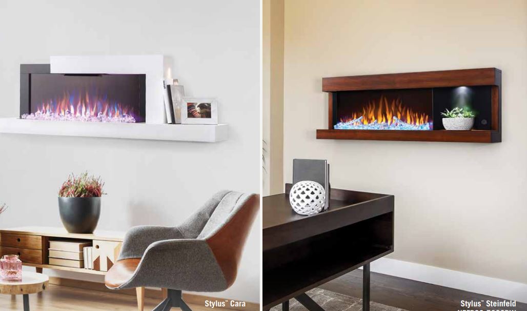 The Stylus is a wall mount Electric Fireplace that comes in two styles: the Stylus Cara comes with a 59″ wide contemporary white surround and the Stylus Steinfeld comes with a 53″ wide burnished walnut encased surround. Both feature a shelf lit up by an accent light and smart LED double USB plug that indicates when your mobile device has finished charging, by turning from red to green. The calming, eye-catching flames come in four color settings and five brightness settings which when combined with the six color options of the ember bed create the ultimate in customization – a perfect place to relax and unwind.
